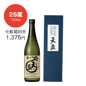 最初のひとくちから、絶えることのないふくよかな香り。さらりとした飲みやすさとたしかなコク。お湯割り、ロック、水割りとオールマイティに楽しめる25度は天盃のまさにスタンダードです。